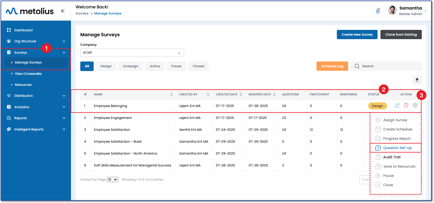 - In the Action column, click the gear icon inline with the survey you wish to edit. Choose Question Set-Up.