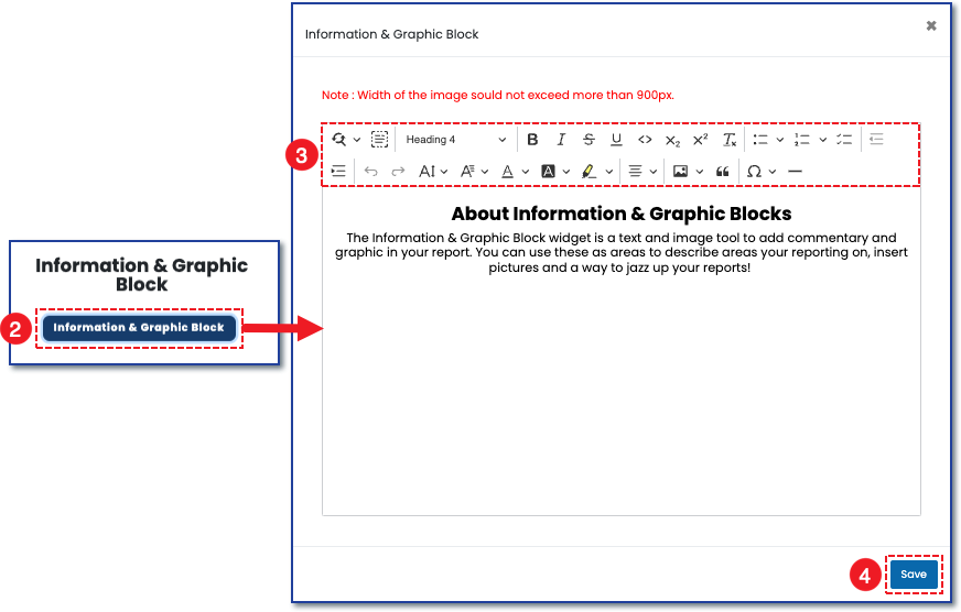 - Customizable Layouts: Users can tailor the layout of the Information & Graphic Block widget to fit the specific needs of their report, choosing how text and graphics are arranged for optimal impact.