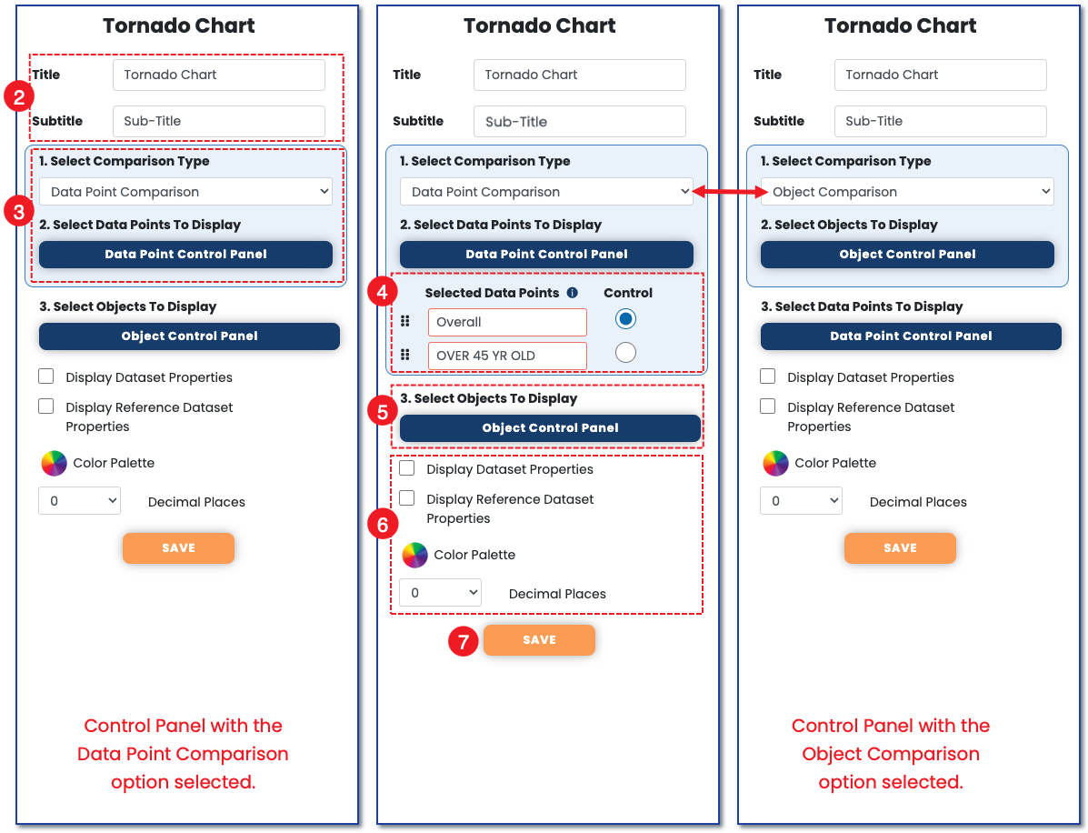 Tornado charts compare either two data points to each other across several objects, or two objects to each other across several data points. The third control panel far right, has object chosen as its comparison type. The double-sided arrow shows the difference between the two. When you choose either data point or object from the "Select Comparison Type" dropdown, the other will reposition to item number three in the control panel.