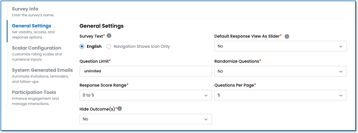 - Default Response View as Slider - By default, response options are displayed as a vertical list with radio button selections. If you prefer to set the default display to a horizontal slider, select "Yes" from the dropdown menu. Additionally, for each question you create, the option exists to configure the response choices as a horizontal slider.