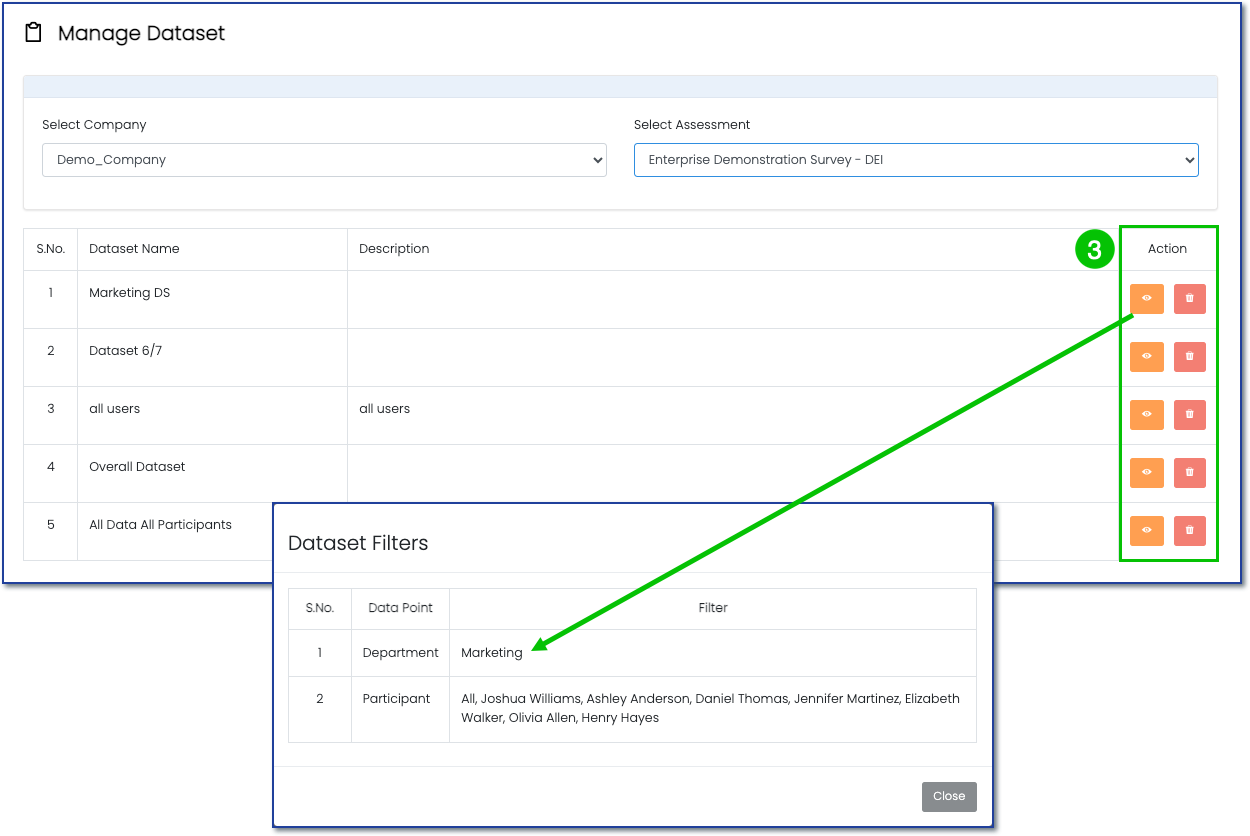 3) Once the datasets populate you can preview them to see what they are comprised of (see inset), or you can delete them. Both buttons are located in the Action column.