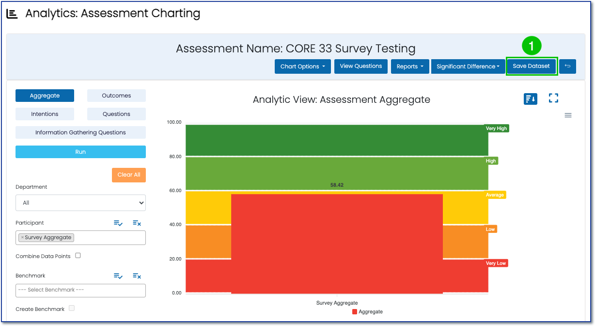 With just a click, seamlessly transition from charting to Intelligent Reporting. While in charting, find the 'Save Dataset' button in the top right corner (item #1 in the screenshot below) that transfers the dataset currently displayed in charting directly to the IR environment.