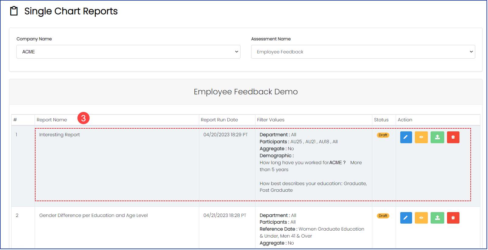 Accessing Saved Reports 3) After selecting a chart type, the list of reports will populate. From left to right the columns offer the following information: