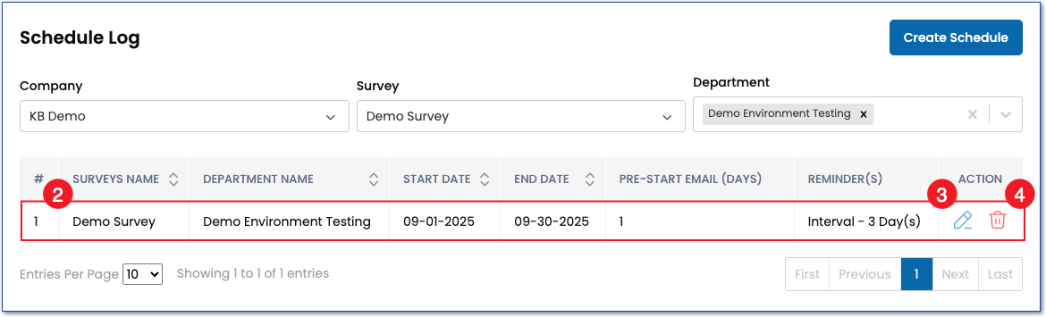 - On the Schedule Log page, find the survey that has the schedule you wish to edit or delete.