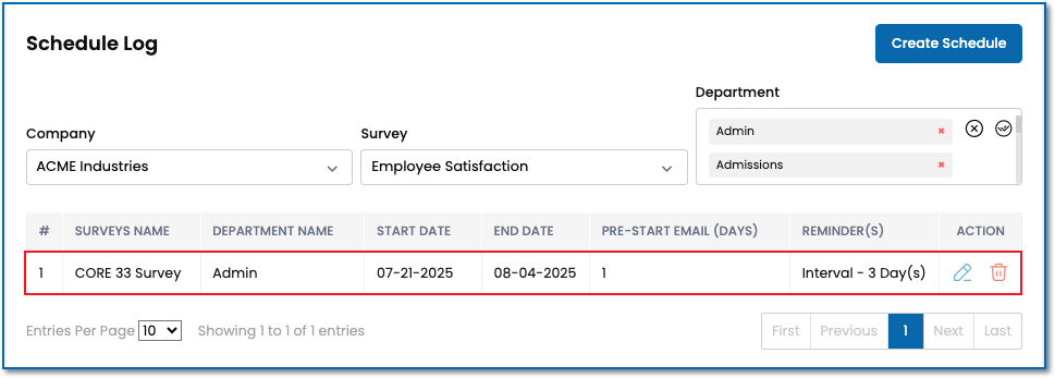 - When the Schedule Log page appears, select a Company (Enterprise subscribers only. All other plans will have their company name pre-populate). Then select a Survey and Department from the dropdown menus to generate the list of schedules for those selections.